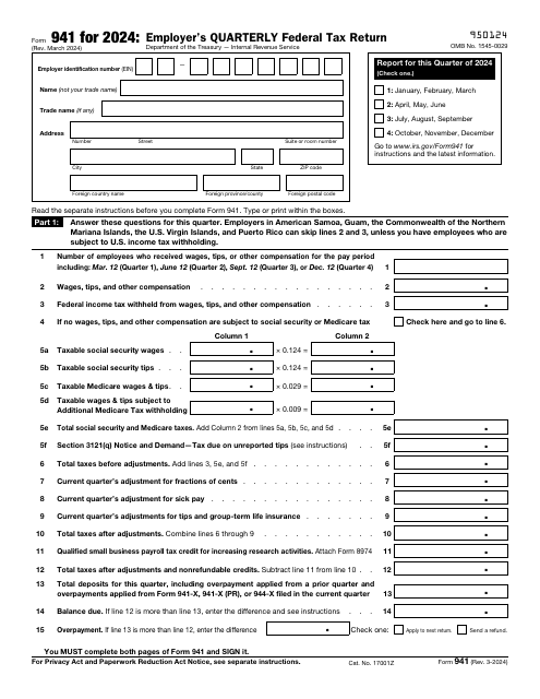 IRS Form 941 is a quarterly tax form that employers use to report wages paid, tips received, and taxes withheld from employees. It is important for employers to accurately complete and submit Form 941 to the Internal Revenue Service (IRS) to ensure compliance with tax laws and regulations. For the year 2024, employers can find a printable version of Form 941 on the IRS website.