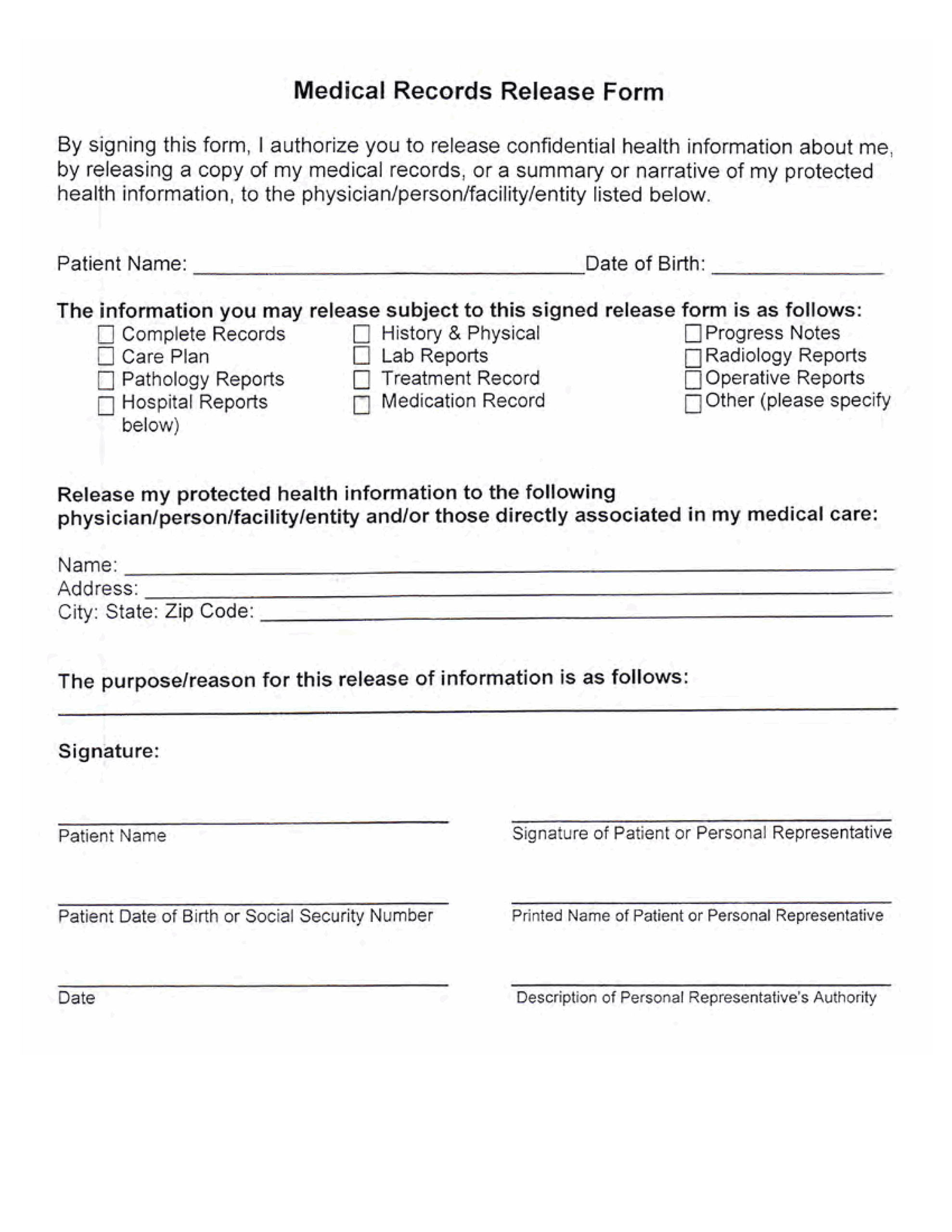 A printable blank medical records release form is a convenient and easy-to-use document that allows you to authorize the release of your medical information to a third party. By using this form, you can ensure that your records are shared securely and in compliance with privacy regulations.