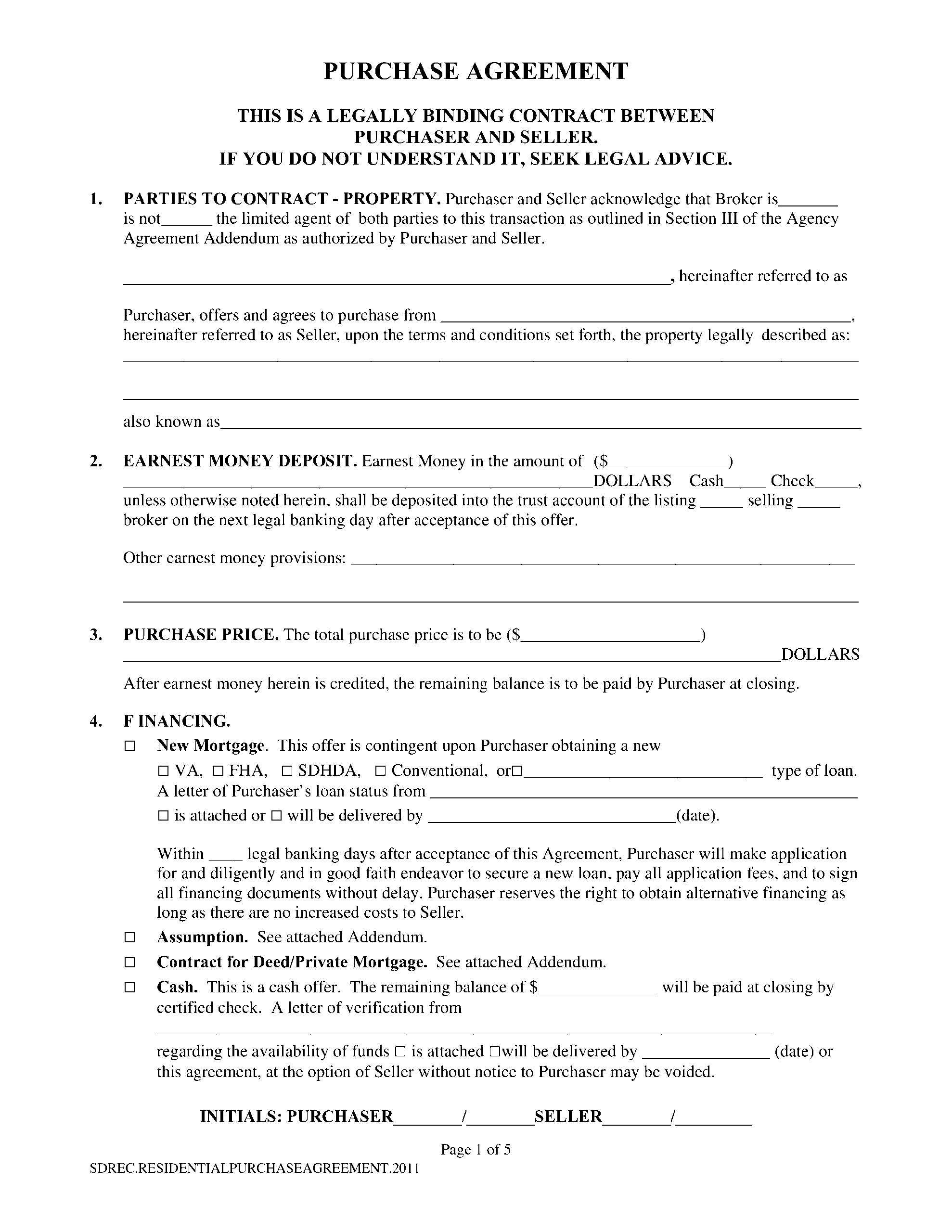Printable Free Blank Purchase Agreement Form
