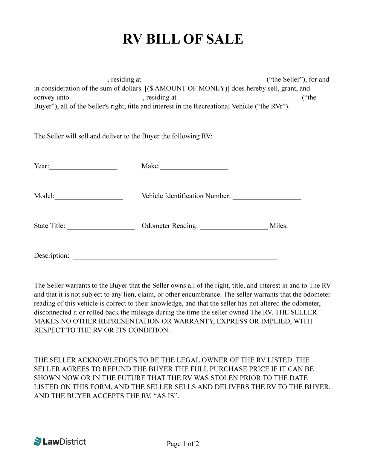 Don’t wait until the last minute to get a bill of sale form for your RV transaction. Use a printable form to ensure that all necessary information is included and protect yourself during the buying or selling process.