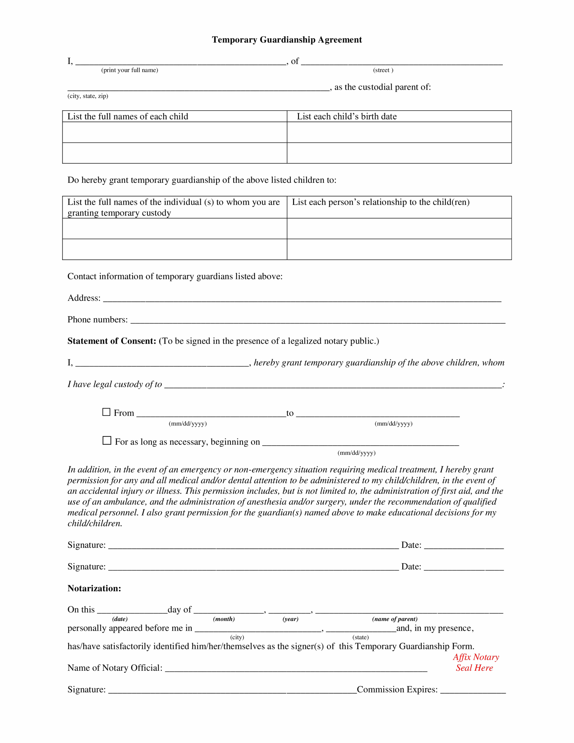 When filling out a temporary guardianship form, it’s important to be thorough and accurate in providing all the necessary information. This includes specifying the responsibilities and limitations of the temporary guardian, as well as any special instructions or medical information regarding the children. Once the form is completed and signed by all parties, it should be kept in a safe place for easy access when needed.